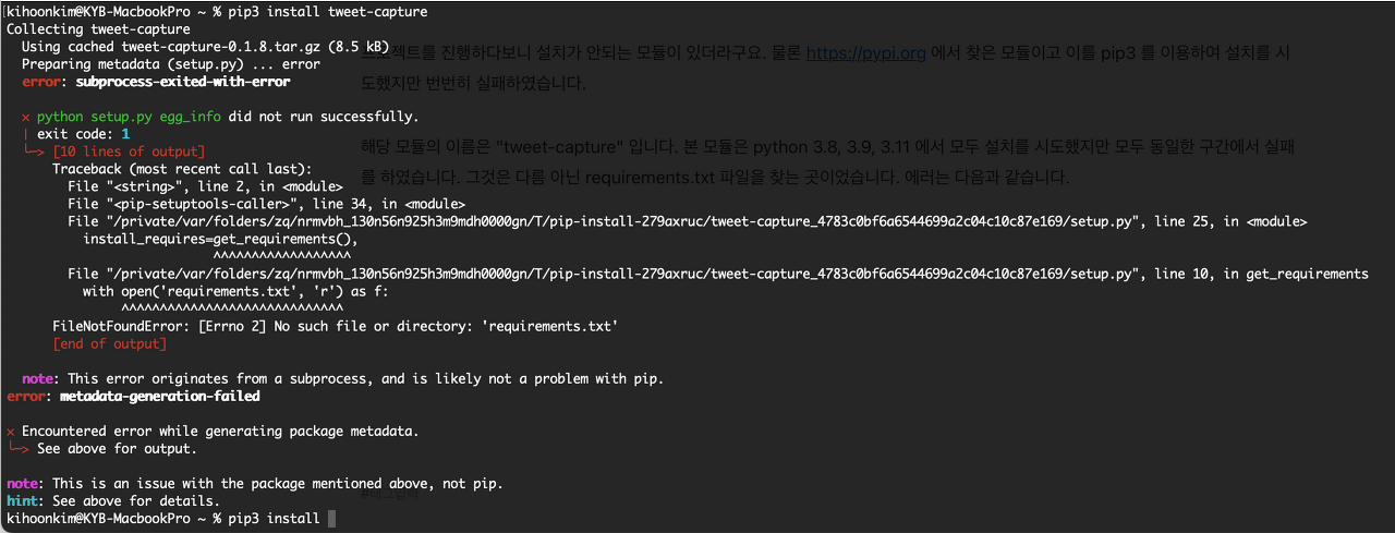 해당 모듈의 이름은 "tweet-capture" 입니다. 본 모듈은 python 3.8, 3.9, 3.11 에서 모두 설치를 시도했지만 모두 동일한 구간에서 실패를 하였습니다. 그것은 다름 아닌 requirements.txt 파일을 찾는 곳이었습니다. 에러는 다음과 같습니다.